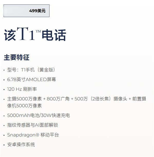 T1整体采用金色机身,此前贯穿后盖的巨大“T1”字样已移除,只保留了美国国旗标识。